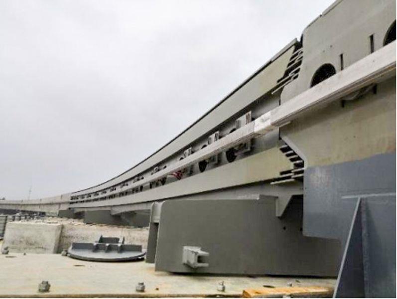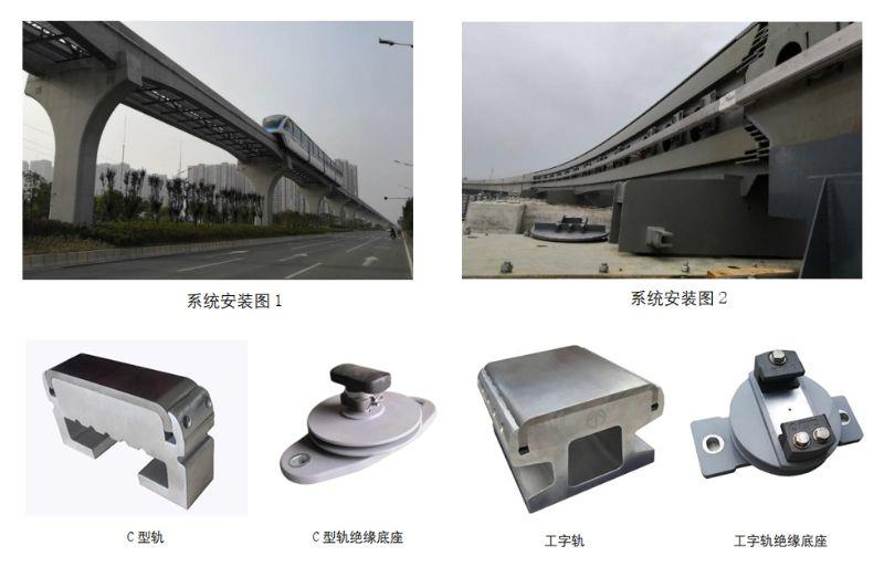 跨座式單軌鋼鋁復合接觸軌系統產品安裝于軌道梁兩側, 通過集電靴向電力機車提供電能。該系統產品具有使用壽命長、維護量小、安裝操作簡單等優點, 尤其適用于小限界安裝使用。