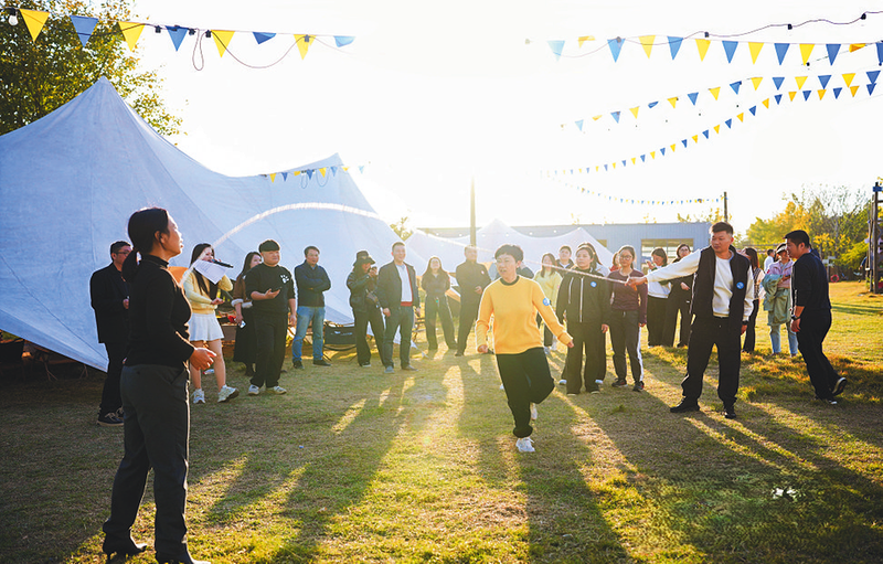 ??11月25日,中鐵六局路橋公司工會(huì)聯(lián)合湖南省直工會(huì)共同舉辦趣味運(yùn)動(dòng)會(huì)。活動(dòng)設(shè)置集體跳繩、旱地冰壺、枕頭大戰(zhàn)等項(xiàng)目。圖為集體跳繩。?劉江源 攝