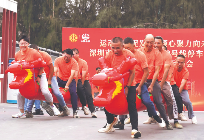 ??近日,中鐵四局深圳市城市軌道交通22號線停車場項目部舉辦產業工人趣味運動會。圖為旱地龍舟比賽。?李永 攝