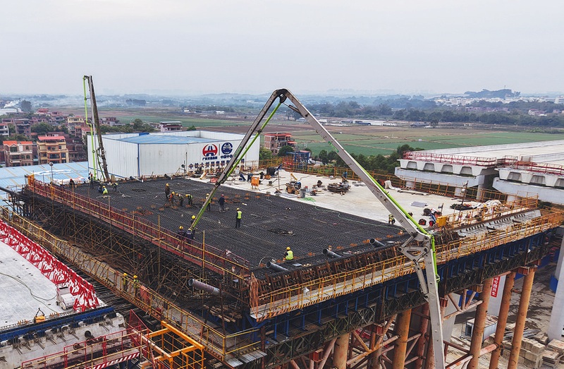??北江特大橋主橋全長1440米,設計為主跨360米四塔雙索面半漂浮體系混凝土梁斜拉橋,是目前國內同類規模最大橋梁。本次完成的邊跨現澆梁全長40.33米、寬37.6米、高3.6米,分兩次澆筑,累計澆筑混凝土2262立方米。圖為主橋整體和邊跨澆筑。?楊啟顏 鄒磊 攝影報道