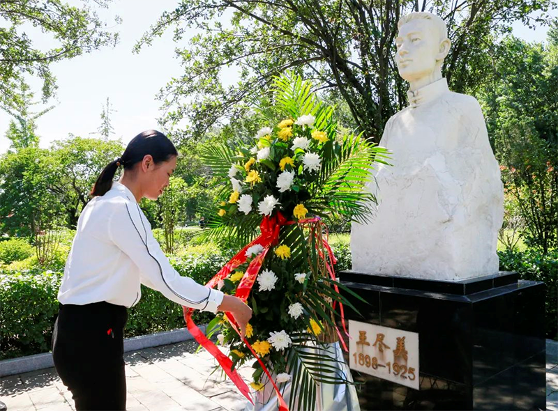 黨的十九大代表、中鐵九橋電焊特級(jí)技師王中美向王盡美塑像敬獻(xiàn)花籃