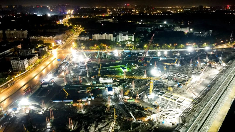 中國(guó)中鐵建工集團(tuán)積極克服交叉施工、場(chǎng)地狹小、營(yíng)業(yè)性施工等不利條件,提前15天進(jìn)入鋼結(jié)構(gòu)施工階段;創(chuàng)新采用逆作法施工技術(shù),置換地上與地下施工工序,僅用80天高質(zhì)量同步完成鋼網(wǎng)架與混凝土結(jié)構(gòu)施工任務(wù)。