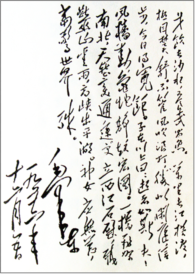 楊在田又拿出紙和筆請毛主席題詞。毛主席認真地說:“這可要好好想一想。”王任重說:“主席,您就題‘一橋飛架南北,天塹變通途’嘛。”“到東湖后考慮考慮再寫。”毛主席說,隨后與大家握手告別。幾天后,毛主席派人送來了題詞,正是“一橋飛架南北,天塹變通途”。